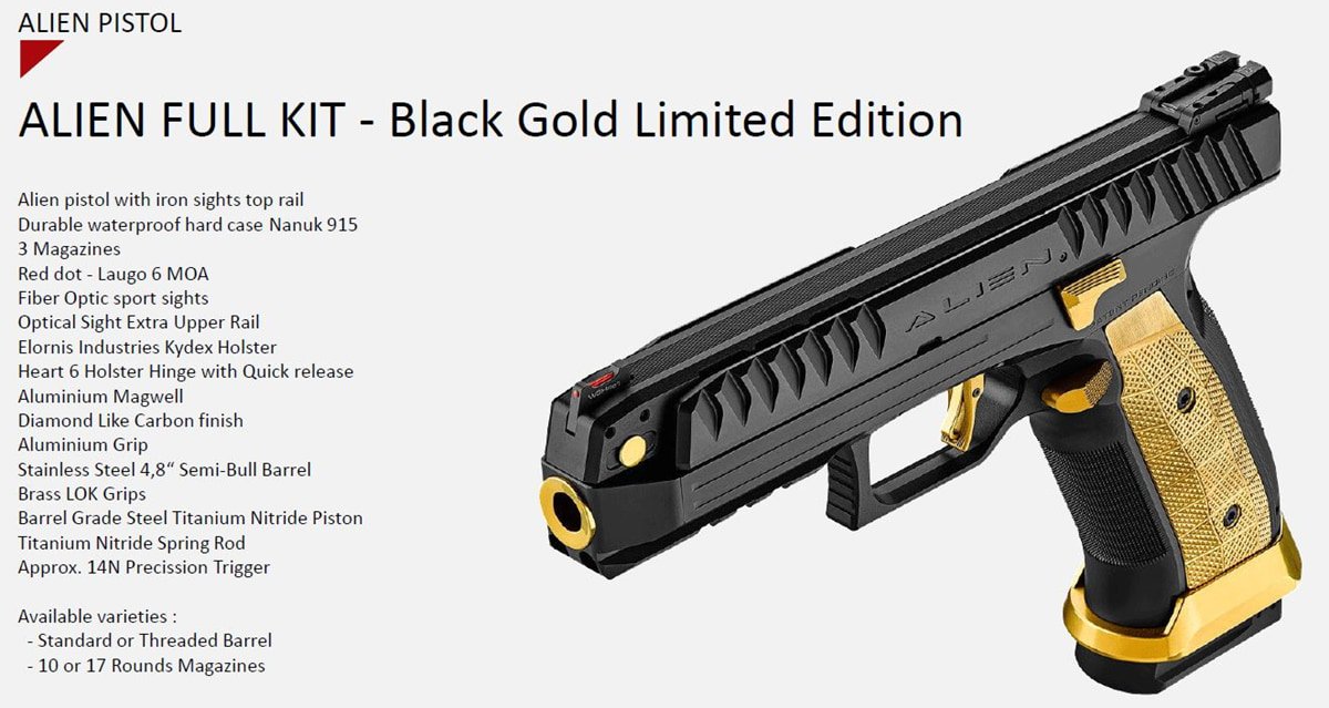 StartKurzwaffenPistolenAlien Full Kit – Black Gold Limited EditionAlien Full Kit – Black Gold Limited EditionCHF7,102.00 Alien Full Kit – Black Gold Limited Edition Hersteller Links zu Laugo Alien Full Kit - Black Gold Limited Edition Menge Buy now Add to WishlistRemove from Wishlist Add to Wishlist Guaranteed safe checkout Kategorie: Pistolen Product ID: 58441 DescriptionSpecificationsReviews (0) Rezensionen Es gibt noch keine Rezensionen. Schreibe die erste Rezension für „Alien Full Kit – Black Gold Limited Edition“ Antwort abbrechenDeine E-Mail-Adresse wird nicht veröffentlicht. Erforderliche Felder sind mit * markiertName * E-Mail * Meinen Namen, meine E-Mail-Adresse und meine Website in diesem Browser für die nächste Kommentierung speichern. Deine Bewertung * Bewertung… Perfekt Gut Durchschnittlich Passabel Sehr schlecht Deine Rezension * I agree that my submitted data is being collected and stored. Ähnliche Produkte Add to WishlistRemove from Wishlist Add to Wishlist Beretta APX 9mm Para Black CHF839.00 Buy now Add to WishlistRemove from Wishlist Add to Wishlist Beretta PX4 Storm F 9mmPara 17 Sch CHF812.00 Buy now Add to WishlistRemove from Wishlist Add to Wishlist B&T Universal Service Weapon – USW-A1, Kal. 9 x 19 mm CHF2,504.00 Buy now