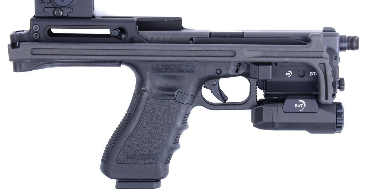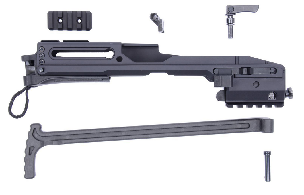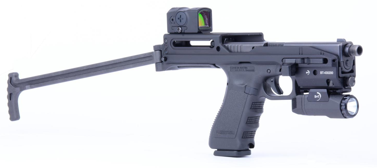 Der USW-G17 Schaft ist der ultimative Umbaukit für die Glock 17 und 19. Er ermöglicht es dem Anwender die Waffe als Pistole aber auch mit Anschlagschaft zu verwenden, wobei der Wechsel dank des intergrierten Anschlagschaftes in Sekundenbruchteilen möglich ist.
