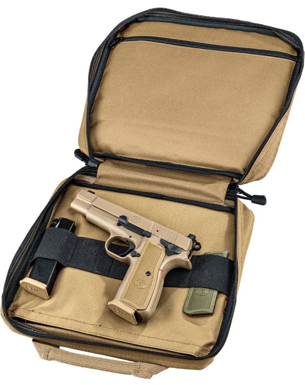 Geschmackvoll modernisierte Pistole im Stil der klassischen High Power, einschließlich charakteristischer Schlittenverjüngung, langarmigem Schlittenauslöser, Schlüsselloch-Mündung, Daumenvertiefung am Schlitten und mehr.